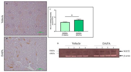 DAPA increases SGLT2 protein expression in the kidneys of diabetic Akimba mice. Representative images of SGLT2-stained kidney tissues from diabetic Akimba mice treated with Vehicle (A) and diabetic Akimba mice treated with DAPA (B), SGLT2 quantification (C) and immunoblots for SGLT2 and b-actin (D). Scale bar = 100 µm; n = 4 mice/group; using student’s t-test * p ≤ 0.05; DAPA: Dapagliflozin.