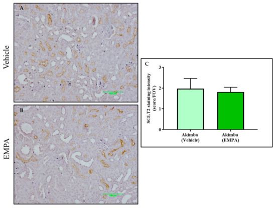 EMPA was not associated with increased SGLT2 protein expression in the kidneys of diabetic Akimba mice. Representative images of SGLT2-stained kidney tissues from diabetic Akimba mice treated with Vehicle (A) and diabetic Akimba mice treated with EMPA (B) and SGLT2 quantification (C). Scale bar = 100 µm; n = 3 mice/group; EMPA: Empagliflozin.