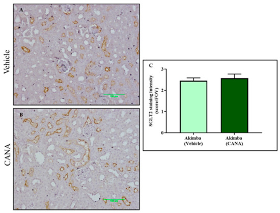 The detection of SGLT2 protein expression in kidney tissue from Kimba and Akimba mice was conducted as published previously [18]. Briefly, kidney tissue was fixed in 10% buffered formalin for 24 h, followed by wax embedding. Paraffin sections (5 μm) were collected and mounted on slides. For antigen retrieval, slides were heated for 2.5 min in a pre-heated 1× EDTA buffer (pH 8.5; Sigma-Aldrich, Sydney, NSW, Australia). After washing twice in PBS/0.1% Tween for 5 min, tissue sections were outlined with a paraffin pen. Sections were blocked with 3% H2O2 for 10 min, washed twice with PBS/0.1% Tween for 5 min, and blocked with 5% FBS in PBS/0.1% Tween for 1 h in a humidified chamber. Sections were then incubated overnight at 4 °C in a humidified chamber with both rabbit anti-SGLT2 (1:200; Novus Biologicals, Littleton, CO, USA) and mouse anti-SGLT2 antibodies (1:50; Santa Cruz Biotechnology, Santa Cruz, CA, USA) in 5%FCS/PBS/0.1% Tween. Following overnight incubation, sections were washed three times with PBS/0.1% Tween for 5 min and incubated with anti-rabbit (1:100, Santa Cruz Biotechnology, Sydney, NSW, Australia) and anti-mouse (1:100, Santa Cruz Biotechnology, Sydney, NSW, Australia) secondary antibodies conjugated with HRP in PBS/0.1% Tween for 1 h. This was followed by incubation with diaminobenzidine (DAB). Slides were counterstained with hematoxylin, dehydrated, and mounted with DPX (Sigma-Aldrich, Sydney, NSW, Australia).