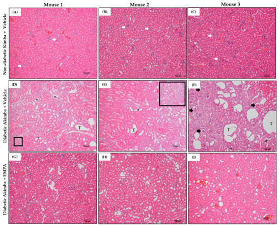 Representative images of H&E-stained kidney tissues from non-diabetic Kimba mice treated with Vehicle (A–C), diabetic Akimba mice treated with Vehicle (D–F) and diabetic Akimba mice treated with EMPA (G–I). Glomeruli (A–C; white arrows), tubular dilation (D–F; black asterisks), degeneration, and vacuolation of renal tubules (D–F; letter T), tubulointerstitial fibrosis (E; black box) and shrunken glomeruli with wide Bowman’s spaces (F; black arrows) are shown. Scale bar = 100 µm; Magnification = 100×; representative images are shown for 3 mice/group. EMPA: Empagliflozin.