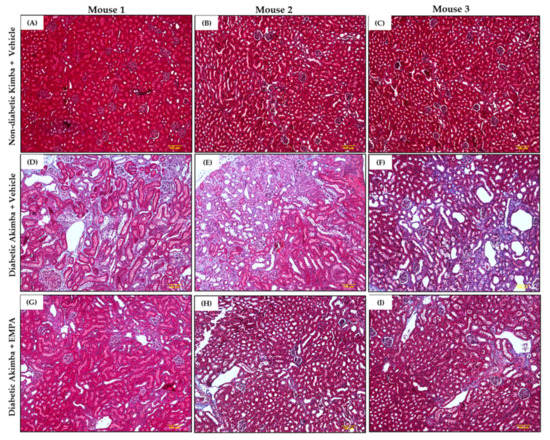 Representative images of Masson’s Trichrome-stained kidney tissues from non-diabetic Kimba mice treated with Vehicle (A–C), diabetic Akimba mice treated with Vehicle (D–F) and diabetic Akimba mice treated with EMPA (G–I). Collagen fibers stained blue in diabetic kidneys indicating renal interstitial fibrosis. Scale bar = 100 µm; Magnification = 100×; representative images are shown for 3 mice/group. EMPA: Empagliflozin.