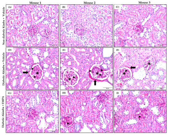 Representative images of Masson’s Trichrome-stained kidney tissues from non-diabetic Kimba mice treated with Vehicle (A–C), diabetic Akimba mice treated with Vehicle (D–F) and diabetic Akimba mice treated with EMPA (G–I). Glomerular hypertrophy (D–F; black asterisks), basement membrane thickening (D–F; black arrows), and mesangial matrix deposition (D–F,H,I; black arrow heads). Scale bar = 50 µm; Magnification = 400×; representative images are shown for 3 mice/group. EMPA: Empagliflozin.