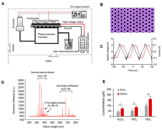 A portable and miniaturized DBD (dielectric-barrier-discharge) plasma device was developed at our laboratory [25] with a DC (Direct Current) input, an AC (Alternating Current) booster unit, an air pump, and a cooling system (Figure 1A). See the plasma discharge photo in Figure 1B. We measured the voltage and current of the AC boost system using a high-voltage probe (Tektronix, P6015A, Beaverton, OR, USA) and a current probe (Tektronix, P6021, Beaverton, OR, USA), and observed it using an oscilloscope (Agilent, DSO-X 2014A, Santa Clara, CA, USA). The results are shown in Figure 1C, where the voltage applied to the electrodes was sinusoidal at 15 kHz with a peak-to-peak voltage of 6 kV; the total power was 40 w. Effluent from the DBD was allowed to react in a downstream reaction chamber and then left to activate saline in a container at a flow rate of 15 L/min (Figure 1A). The activation time was 10 min for 5 mL of saline for all experiments.