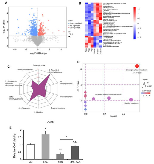 PAS regulated tumor growth in vivo through the glycerophospholipid metabolic pathway. Nude mice bearing A375 xenografts were treated with saline and PAS. (A) Volcano plot of the differential metabolite screening. (B) Cluster analysis of all differential metabolites. (C) Radar chart analysis of PAS vs. saline groups. (D) Metabolic pathway related to differential metabolites. (E) Cell proliferation was assessed using a cell counting kit (CCK) assay after the cells were treated with LPA (1 μM) and PAS for 24 h. Data represent the mean ± SD; n = 3; * p < 0.05; ** p < 0.01.