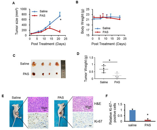 PAS injection significantly suppressed Tca-8113 xenograft tumor growth in vivo. Nude mice bearing Tca-8113 xenografts were grouped and treated with saline or PAS. The tumor size (A) and body weight (B) were measured. At the end of the experiment, tumors were harvested and weighed (C,D). Tumor sections were stained with H&E (upper panel) and Ki-67 (lower panel) (E). (F) Quantitative analyses of Ki67-positive cells were performed with ImageJ. Data represent the mean ± SD; n = 4; * p < 0.05; scale bar = 50 μm.