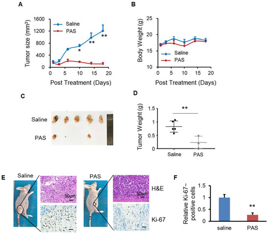 Non-small-cell lung cancer (NSCLC) is the most common malignancy worldwide. It is usually diagnosed at an advanced stage and remains the leading cause of cancer-related death worldwide. In this study, we evaluated the anticancer effects of PAS on NSCLC cell lines (A549) in vivo. Regarding the antitumor effect of PAS on solid tumors, the PAS group showed significantly inhibited A549 tumor growth (by approximately 91%) compared with the saline group (Figure 7A). The mice from the two groups maintained a comparable body weight during PAS treatment (Figure 7B), suggesting few or no side effects associated with PAS treatment. In addition, the anticancer effects of the drug treatment were also confirmed by measuring the tumor weight. When the experiments were terminated, the tumors were harvested and weighed. Compared with the saline group, the PAS group showed significantly lower tumor weights (Figure 7C,D), and IHC staining showed that the positive rate of Ki-67 in tumor cells of the PAS-injected treatment group was significantly lower (Figure 7E,F), further indicating that PAS shows significant antitumor efficacy in human NSCLC in vivo.