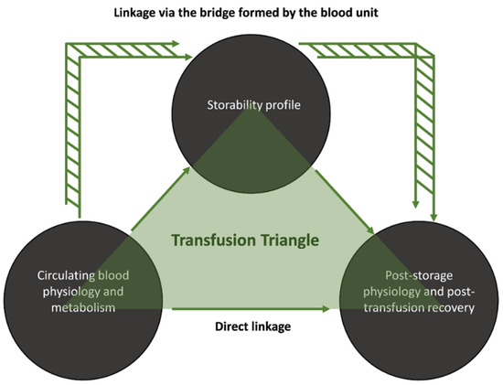The currently proposed triangular approach of transfusion research has the potential to provide reliable and statistically solid links between donors, blood units and post-storage/post-transfusion metrics (probably recipient factors, too). It also highlights the significance of (a) cellular indices that may affect RBC performance, as with the case of sub-lethal storage lesions in βThal+ RBCs and (b) direct linking between donor attributes and transfusion outcomes, which presuppose analyses in freshly drawn blood. Regarding the first point, the correlation profile of sublethal defects versus the typical hemolysis metric stands as a representative example. It seems that the multiparametric nature of spontaneous hemolysis [20] does not allow for the completion of a transfusion triangle, while at the same time both osmotic and mechanical fragilities arise as candidate biomarkers of RBC physiology and 24 h post-transfusion recovery in mice. As for the second observation, notable potential links of donor characteristics (including RBC metabolism) with the post-transfusion performance have been lately reported in obese and G6PD-deficient donor groups [7,8]. However, the need for such paired studies cannot a priori bypass the storage factor since the blood unit represents a dynamic rather than a static state (i.e., aging pathways related to both storage and metabolic time) that links donors to recipients in time and space; therefore, it is important to consider both the links between freshly drawn and stored blood [21,22], as well as those between stored and transfused blood [7,19].