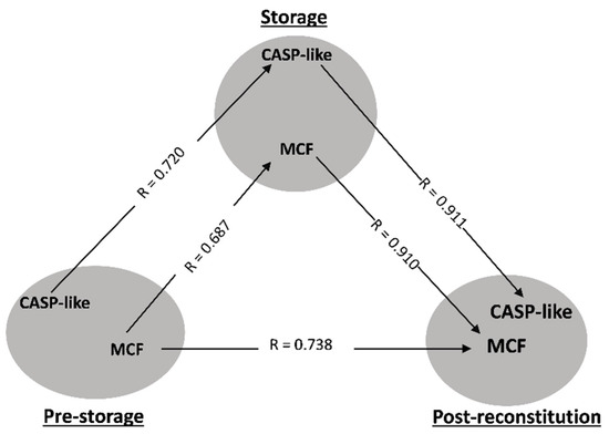 Statistically significant correlations between freshly drawn blood, stored, and reconstituted RBCs from control donors. The correlation triangles focus on osmotic fragility (MCF) and caspase-like (CASP-like) proteasomal activity. All connections represent repeatable (at every recipient plasma and storage time-point measured) significant correlations. The R-values concern late storage and thalassemic plasma.