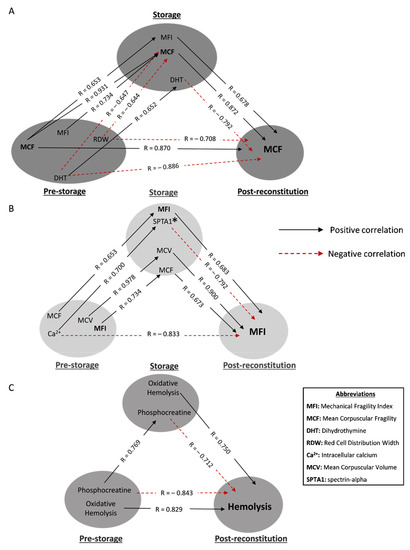 The mechanical hemolysis of reconstituted samples positively correlated with both the mechanical and osmotic fragility of stored RBCs, as well as with their mean corpuscular volume (MCV), which varied proportionally to the in vivo levels (Figure 3B). An interesting finding was the direct negative link between the baseline levels of intracellular calcium and mechanical hemolysis under in vitro recipient-mimicking conditions. This link was broken in the other two sides of the triangle by (a) a positive correlation of calcium with integral membrane/cytoskeletal proteins of stored RBCs and (b) a subsequent negative correlation of the latter with the mechanical fragility index post storage (Figure 3B).