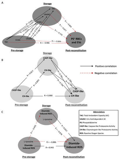 Statistically significant redox-related correlations between freshly drawn blood, stored, and reconstituted RBCs from beta-thalassemia trait (βThal+) donors. The correlation triangles focus on (A) PS-exposing RBCs and extracellular vesicles (EVs), (B) proteasome activity and (C) diamide-induced intracellular ROS of reconstituted samples. All connections represent repeatable (at every recipient plasma and storage time-point measured) significant correlations. The R-values concern late storage and thalassemic plasma. Antioxidant capacities of (A) are extracellular, while urate is the intracellular metabolite.