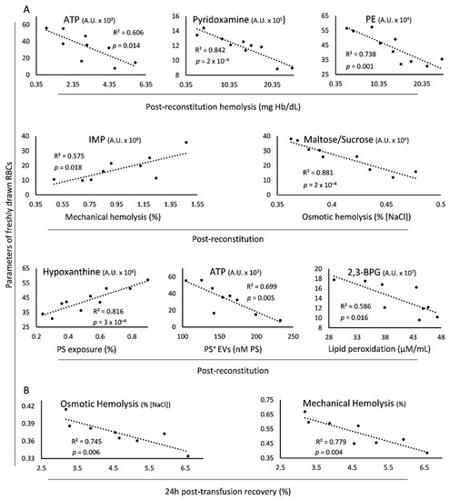 Statistically significant correlations of parameters of freshly drawn blood with the post-reconstitution physiology and 24 h recovery of beta-thalassemia trait (βThal+) donated RBCs. (A) Baseline levels of metabolites correlating with physiological parameters of reconstituted RBCs. (B) Baseline fragility indices correlating with post-transfusion recovery in mice. The selected scatterplots concern late storage, thalassemic plasma (A) and C57BL/6J mice (B), but significant connections (with slightly different R2 values) were evident at every condition tested (i.e., early/late storage, control/thalassemic plasma, immunodeficient/sufficient mice), with the exception of ATP and hemolysis, a correlation evident only in early storage. PE: phosphoethanolamine; 2,3-BPG: 2,3-bisphosphoglycerate; PS: phosphatidylserine; EVs: extracellular vesicles.