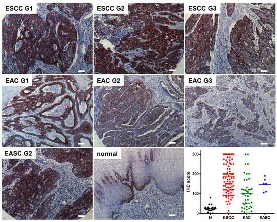 Immunohistochemical detection and quantification of SCTR in esophageal cancer of various histopathological grades (G1, G2, G3) and in normal human esophagi. Representative SCTR immunohistochemistry stainings are presented for ESCC, EAC, EASC and non-cancerous esophagus tissue (normal). In addition, a quantification of the staining (IHC score) for n = 30 normal tissue samples (N) as well as for the three tumor entities ESCC (n = 101), EAC (n = 44) and EASC (n = 6) is presented. Microscopic images were taken using a 10× objective, scale bars represent 100 µm. For higher magnification, see Supplementary Figure S2.