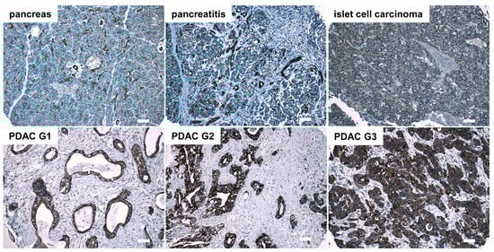 Immunohistochemical detection of SCTR in human normal pancreases, chronic pancreatitis, and islet cell carcinoma as well as in PDAC of histopathological grades G1, G2 and G3. Representative SCTR immunohistochemistry microphotographs are presented. Microscopic images were taken using a 10× objective, scale bars represent 100 µm. For higher magnification, see Supplementary Figure S3.