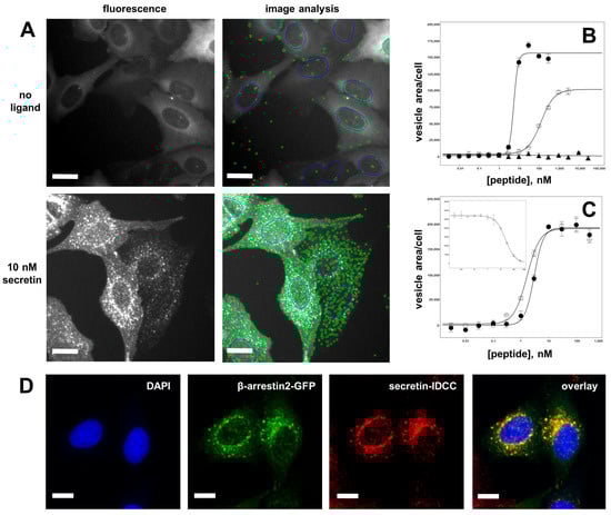 To determine the activity of a large number of different secretin variants, a robust and flexible high-throughput assay had to be established. The transfluor technology was chosen, as it provides for a simple, reliable, and high-throughput-compatible readout system with favorable signal-to-background ratios [,]. U2OS cells stably co-expressing a β-arrestin2-GFP fusion protein (β-arr2-GFP) and human SCTR were used to set up a high-content analysis system (automated microscopy and image analysis) that would allow characterizing SCTR activation by a large number of ligands. This system was designed to accommodate assays run in agonist as well as in antagonist mode. Figure 3A shows the morphological transition of β-arr2-GFP from a diffuse distribution throughout the cytoplasm to a pronounced vesicular pattern found after incubation with 10 nM secretin for 30 min. The segmentation algorithm developed for image analysis provided for an efficient quantification of vesicle areas. These were plotted versus peptide concentration and allowed derivation of concentration–response curves and the calculation of potency (EC50) as well as efficacy (Figure 3B).