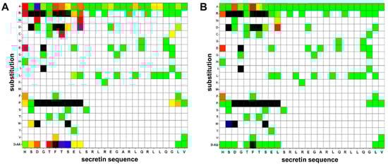 Effects of single amino acid substitutions in secretin on potency (A) and intrinsic activity (B). Single amino acids of human secretin were substituted by other natural, or the respective D-amino acids, activity measured by β-arr2-GFP translocation. The x-axis displays the native sequence of secretin while the y-axis shows the individual amino acid exchange. D-AA indicates a substitution by the respective amino acid in D-conformation. (A) Amino acid substitutions depicted in green showed no elevation in the resulting EC50 value (EC50 of native secretin: 3.26 ± 0.80 nM), yellow: EC50 up to 20 nM, red: EC50 up to 200 nM, blue: EC50 up to 2000 nM, and black: not detectable. White areas indicate variants not studied. (B) Amino acid substitutions labeled in green display an intrinsic activity comparable to unmodified human secretin (100%). The course from yellow over red, blue towards black indicates deterioration of the intrinsic activity: yellow: efficacy below 80%, red: below 60%, blue: below 40%, and black: not detectable. White areas indicate variants not studied. All values shown represent the statistical mean of at least three independent experiments performed in duplicates.
