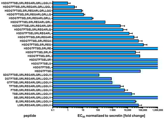To further elucidate the contribution of amino- and carboxyterminal domains of secretin to the peptide’s biological activity, the wild-type peptide was successively truncated from either end and variants were evaluated for potency and intrinsic activity. Using the β-arr2-GFP translocation assay, only a small number of activity profiles could be derived within a concentration range up to 10 µM, as truncated peptides dramatically lost activity (data not shown). In direct comparison, cAMP production measurements proved to be of higher sensitivity, displaying EC50 values several orders of magnitudes lower than those derived from β-arr2-GFP translocation experiments. For secretin, e.g., the β-arr2-GFP, EC50 was found to be 3.26 ± 0.8 nM, while that for cAMP production was 0.0012 ± 0.0003 nM. Therefore, characterization of the truncated peptide variants was carried out by intracellular cAMP measurements. Figure 5 displays normalized EC50 values of truncated peptide variants in direct comparison to native human secretin. Progressive truncation on either C- or N-terminus increasingly lowered the potency (Figure 5, Supplementary Table S2). As expected, small amino-terminal truncations yielded a stronger effect than similar changes at the C-terminus.