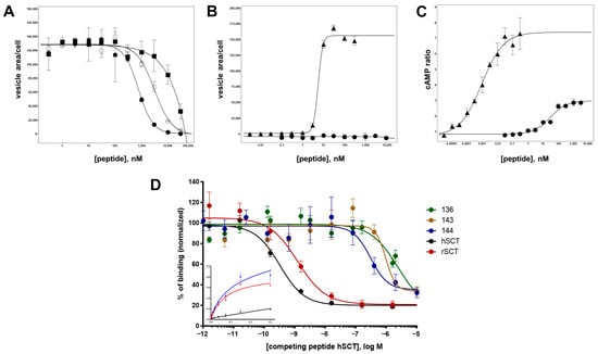 Antagonist and agonist assays of wild-type secretin and selected secretin variants. (A) Peptides 144, 117, and 122 were analyzed for SCTR antagonism in the β-arr2-GFP translocation assay: peptide 144, closed circles (●); peptide 117, empty circles (◯); peptide 122, closed squares (■). (B) SCTR agonism measured in the β-arr2-GFP translocation assay: wild-type secretin, closed triangles (▲); peptide 144, closed circles (●). (C) SCTR agonism measured in the cAMP GloSensor assay: wild-type secretin, closed triangles (▲); peptide 144, closed circles (●). (D) Competition binding of radioligand and secretin variants on U2OS-SCTR membrane isolates. I125-secretin was incubated with purified membranes of SCTR-overexpressing cells. IC50 for human secretin was calculated at 0.325 nM (black), 1.231 nM for rat secretin (red), 2472 nM for peptide 136 (green), 963 nM for peptide 143 (yellow) and 304 nM for peptide 144 (blue). Displayed binding data represent at least three independent experiments, performed in triplicates. Inset: saturation binding curves obtained with I125-secretin used in the aforementioned competition experiments: blue curve: total binding, black curve: unspecific binding, red curve: specific binding (KD = 74 pM).