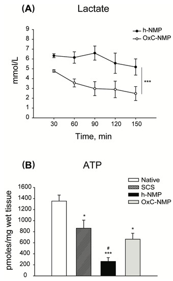 Compared to the Native group, the ATP content of livers subjected to NMP was significantly lower (Figure 1B). However, while livers perfused without OxC showed the smallest amount of tissue ATP across all the experimental groups (p = 0.007), those from the OxC-NMP group had similar ATP concentrations to those observed in the SCS group (p = 0.410) (Figure 1B).