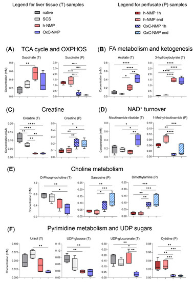 Differentially expressed metabolites in liver tissue and perfusate samples. Metabolic intermediates are grouped according to the following mitochondrial pathways: (A) tricarboxylic acid (TCA) cycle and oxidative phosphorylation (OXPHOS), illustrated by liver and perfusate succinate concentration box and whisker plot; (B) fatty acid (FA) metabolism and ketogenesis, illustrated by liver acetate and 3-HB; (C) creatine metabolism, illustrated by creatine concentration changes in liver tissue and perfusate; (D) NAD+ turnover, illustrated by liver nicotinamide ribotide and perfusate 1-methylnicotinamide (1-MNA) concentration changes; (E) choline metabolism, illustrated by liver O-phosphocholine and perfusate sarcosine and dimethylamine concentration changes; (F) pyrimidine metabolism and UDP sugars, illustrated by liver uracil, UDP-glucose, UDP-glucuronate, and perfusate cytidine concentration changes. Liver (n = 4) and perfusate (n = 5) box and whisker plots, one-way ANOVA with Tukey’s multiple comparison test, p-values: **** p < 0.0001, *** p < 0.001, ** p < 0.01, * p < 0.05. Liver data colors: Naive, dark grey; SCS, light grey; h-NMP light watercolor pink; OxC-NMP, light watercolor blue. Perfusate colors: h-NMP 1h, dark red, vertical striped pattern; h-NMP end, pink, vertical striped pattern; OxC-NMP 1h, dark blue, diagonal stripe pattern; OxC-NMP end, light bright blue, diagonal stripe pattern.