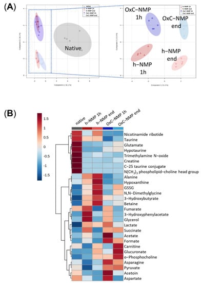 Metabolite concentration changes in bile samples. (A) sPLS-DA scores plots illustrating group separation based on sparse partial least-squares discriminant analysis. When excluding the Native group (dark grey squares), further separation of groups is achieved due to changes in metabolite concentrations in time; h−NMP 1h—dark red triangles, h−NMP end—light red downwards triangles, OxC−NMP 1h—dark blue full dots, OxC−NMP end—light blue empty dots. (B) Averaged heat map illustrating all the group metabolite changes—overview average for each group. Red—relatively increased concentration, blue—relatively reduced concentration. Abbreviation: GSSG, glutathione disulfide (oxidized form).