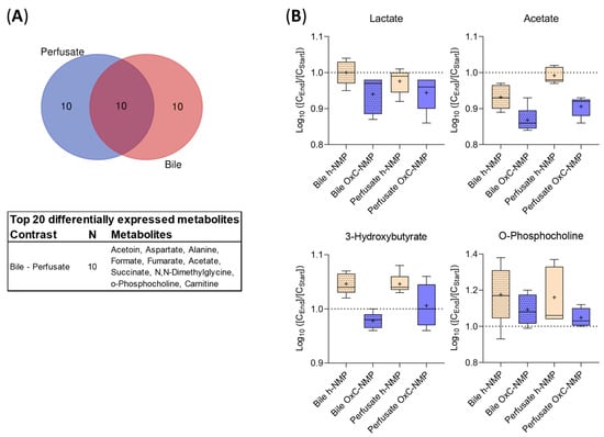 Comparison between metabolite concentrations in bile and perfusate samples. (A) Venn diagram and corresponding table showing the top 20 differentially expressed metabolites in either perfusate or bile samples and their distribution across the analyzed samples. (B) Normalized concentration ratio [CEnd]/[CStart] to logarithmic scale (log10) of metabolite increase (above 1.0 dashed line) or decrease (below 1.0 dashed line) during the perfusion in bile (dotted) and perfusate (clear) at 1 h (yellow) and at the end of NMP (blue), illustrated as bar plots with Tukey’s whiskers; line indicates the median, plus indicates the mean.