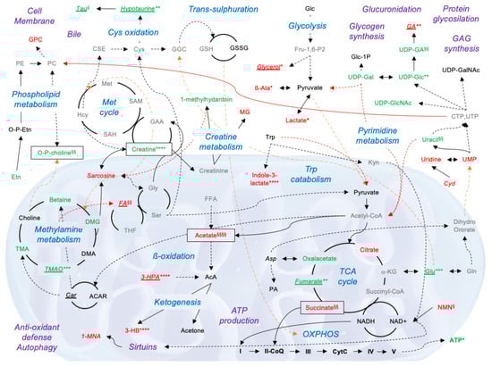 Simplified diagram showing the metabolomic pathways modulated during normothermic machine perfusion (NMP) and their interactions. Metabolites typed in red fonts are upregulated in the NMP groups compared to the Native group, while those typed in green fonts are downregulated. Metabolites typed in black fonts had a similar concentration across ex vivo perfused and native livers. Metabolites detected only in perfusate sample are typed in italics, those detected only in bile samples are in italics and underlined. Metabolites which were undetectable by NMR-based spectroscopy are indicated in gray fonts. Differences across experimental groups were investigated by one-way ANOVA, followed by Tukey’s post hoc test. p-values are indicated as follows: all the NMP groups vs. Native: * p < 0.05; ** p < 0.01; *** p < 0.001, **** p < 0.0001; only OxC-NMP vs. Native: § p < 0.05; §§ p < 0.01; §§§§ p < 0.0001. Black arrows indicate a direct relationship between two metabolites; black dotted arrows denote multiple enzyme reactions to convert one metabolite into another; red arrows link one specific metabolic pathway to a different pathway; orange dotted arrows indicate metabolite translocation from mitochondria to cytoplasm and vice versa. Adapted from KEGG reference pathways. Abbreviations: I, NADH dehydrogenase; II, NADH dehydrogenase; III, cytochrome C reductase; IV, cytochrome C oxidase; V, ATP synthase; 1-MNA, 1-methylnicotinamide; 3-HB, 3-hydroxybutyrate; 3-HPA, 3-hydroxyphenylacetate; α-KG, α-ketoglutarate; AcA, acetoacetate; ACAR, acetylcarnitine; ATP, Adenosine triphosphate; Ala, alanine; Asn, asparagine; Asp, aspartate; CoQ, coenzyme Q; Cyd, cytidine; CPT, cytidine-5′-triphosphate; CSE, cystathionine; CytC, cytochrome C; DMG, N,N-dimethylglycine; Etn, ethanolamine; FA, formic acid; FFA, free fatty acid; Fru-1,6-P2, fructose 1,6-bisphosphate; GAA, guanidinoacetate acid; GAG, glycosaminoglycans; GGC, γ-glutamylcysteine; Glc, glucose; Gln, glutammine; Glu, glutammate; Gly, glycine; GPC, glycerophosphocholine; GSH, reduced glutathione; GSSG, glutathione disulfide (oxidized form); Hcy, homocysteine; IMP, inosine 5′-monophosphate; Kyn, kynurenine; MG, methylguanidine; NMN, nicotinamide ribotide; o-P-choline, O-phosphocholine; o-P-Etn, o-phosphoethanolamine; OXPHOS, oxidative phosphorylation; PA, pantothenic acid; PC, phosphatidylcholine; PCr, phosphocreatine; PE, phosphatidylethanolamine; Ser, serine; Tau, taurine; TGL, triglycerides; THF, tetrahydrofolate; TMA, trimethylamine; TMAO, trimethylamine N-oxide; UDP-GlcNAc, UDP-N-acetylglucosamine; UDP-Gal, UDP-galactose; UTP, uridine-5′-triphosphate; UDP-Glc, uridine diphosphate-glucose; UDP-GalNAc, UDP-N-acetylgalactosamine.