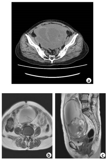 CT and MRI images. (a) Pelvic CT shows a large cystic tumor occupying the pelvic cavity. (b) T2-weighed axial MRI of the pelvis showing a large left ovarian cystic tumor. (c) T2-weighed sagittal MRI of the pelvis showing a large multilobular ovarian cystic tumor.
