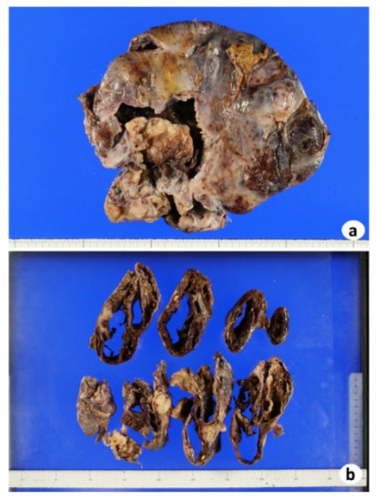 (a) Macroscopic view of a left-ovarian large cystic tumor that was surgically removed. (b) The cut surface of the tumor is multilocular with hemorrhage and necrosis.