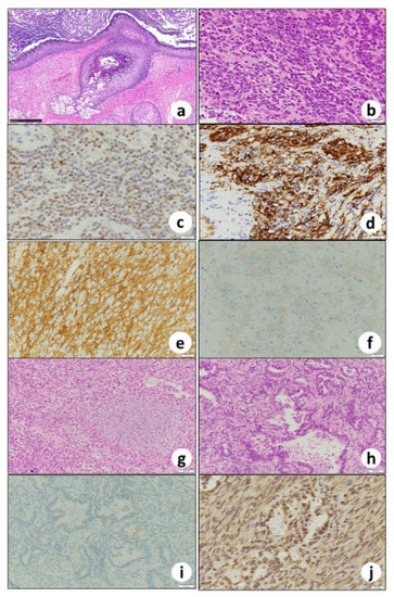 The cystic lesion is lined with (a) epidermis with skin appendages. Histopathology and immunohistochemistry of (b) small round-cell tumor nuclear-positive for (c) NKK2.2, membranous-positive for (d) CD56, cytoplasmic-positive for (e) GFAP, and weakly membranous-positive for (f) CD99, suggesting PNET. Histopathology of (g) spindle cell sarcoma component, partly differentiated to chondrosarcoma and (h) non-specific adenocarcinoma component. Adenocarcinoma component is negative for (i) anti-PAX8 but positive for (j) ARID1A. (a,b,g,h) Hematoxylin and eosin staining, immunohistochemistry of (c) NKK2.2, (d) CD56, (e) GFAP, (f) CD99, (i) PAX8, and (j) ARID1A. Bars: (a) 250 μm; (b–f) 20 μm; and (g–j) 50 μm.