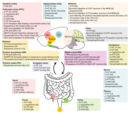 Peripheral 5-HT is mainly produced by enterochromaffin cells from dietary tryptophan in the gastrointestinal tract, and is taken up by platelets or SERT on serotoninergic presynaptic terminals. Peripheral 5-HT regulates gastrointestinal motility and is involved in immune function [103]. An intriguing issue is how peripheral 5-HT affects the central nervous system, given that 5-HT in the central and peripheral nervous systems is separated by the blood–brain barrier. 5-HT may influence enteric nerves, vagal afferent activity, or inflammatory responses, and then modulate the central nervous system indirectly [58]. Another potential mechanism of peripheral 5-HT influence neurodevelopmental process is mediated by the microbiota–gut–brain axis. Previous studies have demonstrated the causal relationship of the microbiota–gut–brain axis and the pathogenesis of ASD, and ~70% of ASD patients show comorbid gastrointestinal disturbances [58]. 5-HT has been shown to modulate bacterial motility and gene expression profile of bacteria in vivo [58,104], indicating complex feedback interactions between 5-HT and microbiota in the gastrointestinal tract. Conversely, the microbiota is known not only to synthesize 5-HT, but also to modulate the serotonergic system in the gastrointestinal tract of the host, suggesting that 5-HT may be a communication molecule of gut–brain interactions. In germ-free mice, TPH (rate-limiting enzyme of 5-HT) is upregulated, and the 5-HT level in the hippocampus is reduced with enhanced anxiety [105,106]. Animal studies have found the abnormal composition of microbiota in ASD-like models, including VPA-treated rodents [84,85,86]. The VPA-treated rodents also showed altered 5-HT, L-tryptophan, 5-HTP, and 5-HIAA levels in serum, colon, feces, cerebellum, and prefrontal cortex [84,85,86]. Given the important role of the microbiota–gut–brain axis in ASD pathophysiology, it would be of interest to see if the modulation of the gut–brain axis by serotonin may be involved in the etiology of ASD.