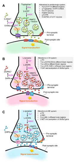Schematic drawings illustrate monoaminergic neurotransmissions and their dysregulation in response to maternal VPA challenge. (A) Serotonergic neurotransmission. (B) Dopaminergic neurotransmission. (C) Norepinephrinergic neurotransmission. The neurotransmission molecules that are altered by maternal VPA treatments are indicated by asterisk*. Abbreviations: ↑, increased; ↓, decreased; 5-HIAA, 5-hydroxyindoleacetic acid; 5-HIAL: 5-hydroxyindole acetaldehyde; 5-HT, 5-hydroxytryptamine (serotonin); 5-HTP, 5-hydroxytryptophan; 5-HTR, 5-hydroxytryptamine receptor; AADC, aromatic L-amino acid decarboxylase; ALDH, aldehyde dehydrogenase; D1R, dopamine D1 receptor; D2R, dopamine D2 receptor; D3R, dopamine D3 receptor; D4R, dopamine D4 receptor; D5R, dopamine D5 receptor; DA, dopamine; DAT, dopamine transporter; DβH, dopamine-β-hydroxylase; DHPG, dihydroxyphenylglycol; DOPAC, 3,4-dihydroxyphenylacetic acid; MAO, monoamine oxidase; mEPSCs, miniature excitatory postsynaptic currents; METH, methamphetamine; NE, norepinephrine; NET, norepinephrine transporter; SERT, serotonin transporter; TH, tyrosine hydroxylase; TPH, tryptophan hydroxylase; VMAT, vesicular monoamine transporter.