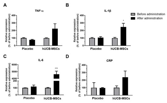 Pro-inflammatory cytokine levels increased in AD patients following hUCB-MSCs injection. Tumor necrosis factor-α (TNF-α), interleukin-1β (IL-1β), interleukin-6 (IL-6), and c-reactive protein (CRP) ELISA was carried out using CSF samples collected before and after administration of saline (placebo, n = 3) or hUCB-MSCs (n = 6). (A) TNF-α, (B) IL-1β, (C) IL-6, and (D) CRP expression levels increased after hUCB-MSCs administration. In the placebo group, there was no difference in expression of all four cytokines before and after administration (* p < 0.05, *** p < 0.0001). The data are presented as the mean ± S.E.M.