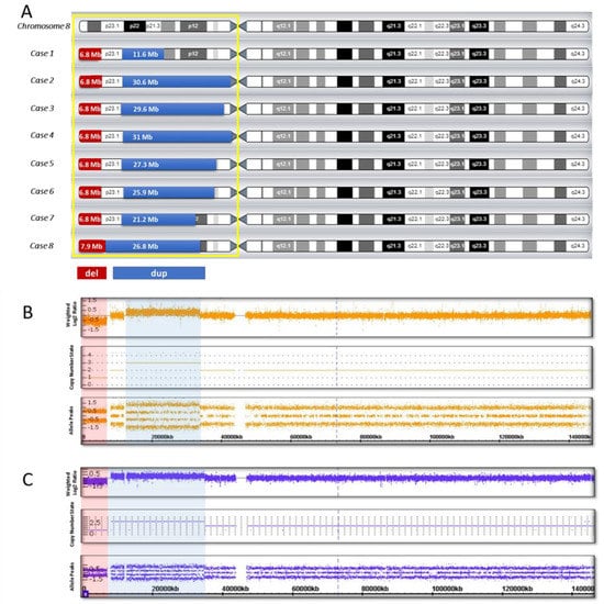 - Okur, V.; Hamm, L.; Kavus, H.; Mebane, C.; Robinson, S.; Levy, B.; Chung, W.K. Clinical and genomic characterization of 8p cytogenomic disorders. Genet. Med. 2021, 23, 2342–2351. [Google Scholar] [CrossRef] [PubMed]