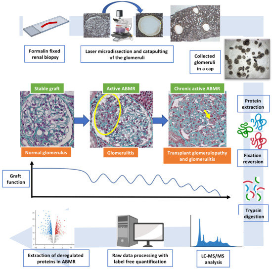Overall analytical strategy of the study. The histological hallmark of kidney active antibody-mediated rejection is glomerulitis i.e., inflammatory cells within the glomerular capillary loops. This lesion can be seen by light microscopy (yellow circle and arrow, Masson’s trichrome staining, original magnification ×400). Prolonged injuries lead to an expansion of the extracellular matrix (stained in green with Masson’s trichrome) and a duplication of the glomerular basement membrane called transplant glomerulopathy. These lesions are associated with graft dysfunction, proteinuria and ultimately allograft loss. Herein we performed a bottom-up proteomic approach on laser microdissected glomeruli during active ABMR, chronic active ABMR and stable graft patients from formalin-fixed and paraffin-embedded allograft biopsies. The key technical steps are presented by following the blue arrow. Abbreviations: ABMR, antibody-mediated rejection.