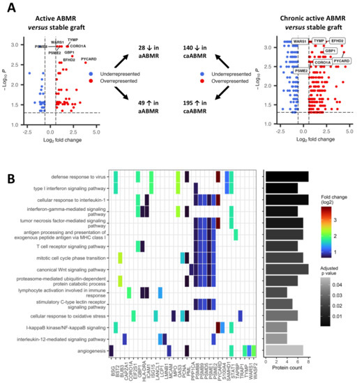 We compared the caABMR to the aABMR group, considered to reflect the changes occurring during antibody-mediated transplant glomerulopathy. Here, 137 proteins were deregulated, including 99 overrepresented and 38 underrepresented proteins. In accordance with adjusted p-values, the top-25 most significant proteins are presented in Table 4 and the whole protein set is listed in Supplementary Table S4.