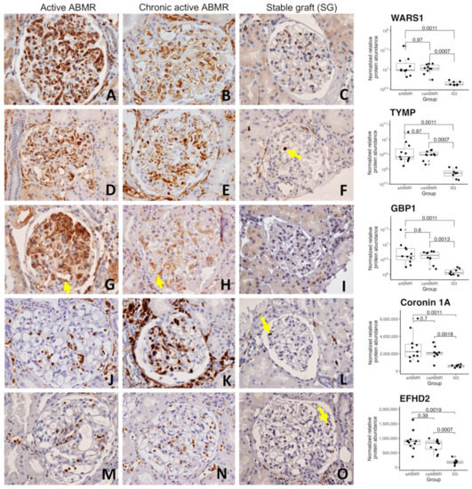 Highlighting glomerulitis with illustrative cases of glomerular immunostains for WARS1, TYMP, GBP1, CORO1A and EFHD2 in active (left), chronic active antibody-mediated rejection (middle) and stable graft control cases (right), original magnification × 400 ((A)–(O), respectively). Corresponding proteomic results depending on groups are displayed on the right-hand side, with adjusted p-values for each comparison (Mann-Whitney U tests and Benjamini-Hochberg correction). (A,B) show a diffuse cytoplasmic overexpression of WARS1 on endothelial cells in a glomerulus of an active and chronic active ABMR cases, with a strong and moderate positivity, respectively, compared to the constitutive weak and segmental endothelial staining observed in the stable graft control (C). (D,E) show a diffuse and moderate to strong overexpression of TYMP in endothelial cells, but also a strong staining in endocapillary inflammatory cells (E). (F) Rare inflammatory cells are strongly stained for TYMP (arrow), without endothelial staining in the glomerulus. (G) shows a strong staining for GBP1 in endothelial (arrow) and inflammatory cells in the glomeruli (focus of glomerulitis at the top). (H) displays a segmental and weak to moderate staining in some endothelial (arrow) and inflammatory cells. (I) No specific staining for GBP1 in a stable graft case. (J,K) show a strong, nuclear and cytoplasmic staining for CORO1A in noticeably all inflammatory cells, wherever they are. Many positive cells are visible in the glomerulus of both ABMR cases, with a segmental and global lesion of glomerulitis, respectively. (L) shows the same expression pattern of CORO1A, but limited to a few inflammatory cells in the peritubular capillaries or the interstitium, and just one cell in the glomerulus (arrow). (M,N) show a moderate to strong, nuclear and cytoplasmic staining for EFHD2 antibody in some inflammatory cells in the glomeruli of both ABMR cases. Of note, stained inflammatory cells are also seen in the nearby peritubular capillaries. (O) shows a similar pattern of expression of EFHD2, but with globally much fewer positive cells, limited in the glomerulus to 2 moderately stained neutrophils (arrow). Abbreviations: ABMR, antibody-mediated rejection.