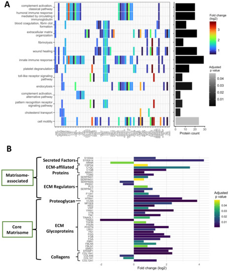 To study the extracellular matrix proteome modifications, we only considered proteins that were recognized by the Human matrisome database from the Matrisome Project [34], using the Matrisome Annotator tool. Distributions of each protein were compared by performing non-parametric Mann-Whitney U tests. p-values were corrected using the Benjamini-Hochberg multiple test correction algorithm.