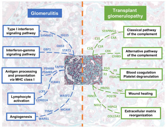 Integrative summary of the most relevant pathways enriched in glomerulitis and transplant glomerulopathy. Main upregulated proteins are depicted for each pathway. Please note that some proteins are shared between pathways, but we chose here to avoid any duplicate for clarity.