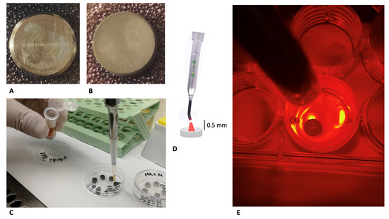 Then, an AlGaAs power LED device (TL-01), characterized by a red light with a wavelength of 630 nm ± 10 nm FHWM nm (Alpha Strumenti, Melzo, Milan, Italy), was used as irradiation source for 7 min at 380 mW/cm2. The tip of the red LED was maintained perpendicular to the upper surfaces of the discs at a constant distance of 0.5 mm using a specific apparatus, as previously described and shown in Figure 1C–E [20].
