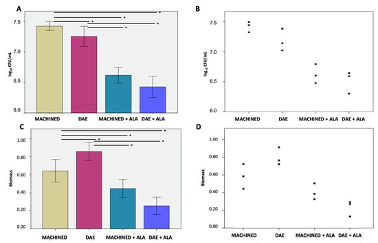 Colony-forming units (A) and relative dot plot (B); biofilm biomass (C) and relative dot plot (D) of Streptococcus oralis biofilm grown for 24 h + 24 h on MACHINED and DAE surfaces with or without being exposed to ALAD–PDI. Negative controls showed no CFUs and no biofilm biomass (data not shown). * p-value < 0.050.