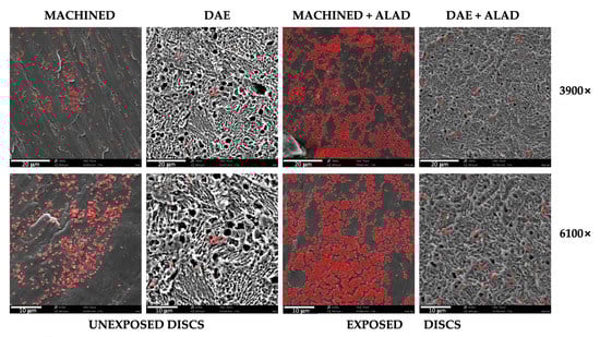 Scanning electron microscope observations at different magnifications, 3900× and 6100×, of Streptococcus oralis biofilm grown for 24 h + 24 h on MACHINED and DAE discs unexposed and exposed to ALAD gel and red LED. Bacteria are colored in red; lighter colors correspond to higher bacterial density.