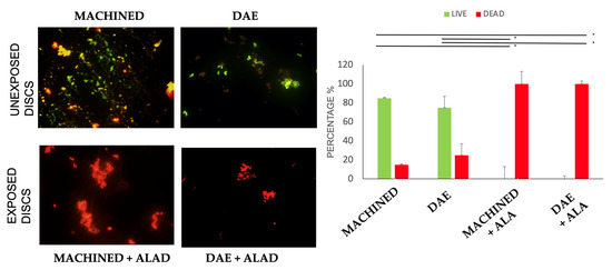 Live/dead staining of Streptococcus oralis biofilm grown for 24 h + 24 h on MACHINED and DAE discs unexposed and exposed to ALAD–PDI. Histograms show percentages of viable and dead cells for each exposed group vs. the unexposed samples, obtained with identical methods in every respect except for exposure to ALAD–PDI (* p-value < 0.050). Negative controls showed no cells (data not shown).