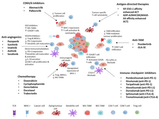 Systemic chemotherapies, including anthracyclines and alkylating agents commonly used for STS treatment, are also able to modulate the tumour immune landscape to promote an anti-tumour response (Figure 1). Anthracyclines such as doxorubicin induce immunogenic cell death, stimulating a caspase-dependent anti-cancer immune response [], while even low-dose cyclophosphamide can selectively suppress inhibitory immune subsets including, Treg cells and MDSCs, inducing IFN-γ-mediated immunity []. Gemcitabine or docetaxel treatment can selectively deplete MDSCs [,] and gemcitabine further upregulates the expression of MHC-I on tumour cells and subsequent tumour-antigen cross-presentation [].
