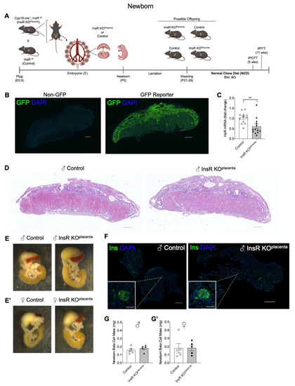 Placentas harvested on E17.5 did not differ in total weight between the InsR KOplacenta and their littermate controls (Figure S1A). Preliminary assessment of the gross placental morphology at E17.5 appears to be comparable between the littermate controls and the InsR KOplacenta placenta (Figure 1D), suggesting that placental IR is not required for the development of the placenta. Fetal body weight and pancreas weight at E17.5 also revealed no differences between the two genotypes (Figure S1B,C). The male and female InsR KOplacenta newborns presented with normal body weight compared to their respective controls (Table 1). There were also no differences in non-fasting blood glucose levels or serum insulin levels at birth among the groups (Table 1). Examination of the gross pancreas morphology, pancreas weight, and liver weight showed no apparent differences between genotypes for either male or female mice (Figure 1E, Table 1). Assessment of the basal pancreatic β-cell mass at birth demonstrated no differences between the InsR KOplacenta and their controls (Figure 1F,G,G’).