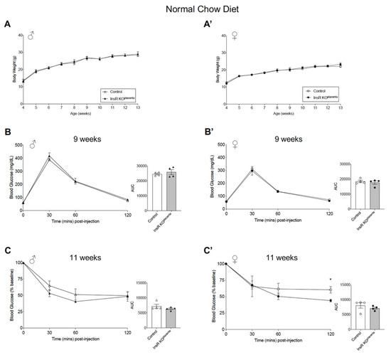 Adult InsR KOplacenta mice displayed normal glucose homeostasis on a normal chow diet. (A) Body weight in all the males (n = 9, 10) and (A’) the female (n = 13) InsR KOplacenta and control mice on a normal chow diet. Body weight for the offspring presented as combined data from parity ≥ 3 and ≤2 litters. (B) IPGTT and AUC analysis (right) for the male (n = 4) and (B’) female (n = 4) mice from parity ≥ 3 on a normal chow diet at 9 weeks of age. (C) IPITT and AUC analysis (right) for the males (n = 4) and (C’) females (n = 4) from parity ≥ 3 at 11 weeks of age. Blood glucose values for IPITT are expressed as the baseline percentage of blood glucose. The values are reported as the means ± SEM, * p < 0.05.