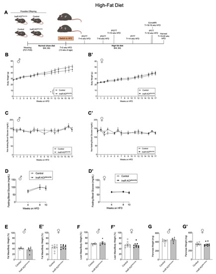 Adult male InsR KOplacenta offspring demonstrated lower body weight under a high-fat diet challenge. (A) Schematic of experimental design for a high-fat diet (HFD). (B) Body weight monitored in all the males (n = 6, 7) and (B’) females (n = 8, 9) from parity ≥ 3 and ≤2 across 17 weeks on a HFD. (C) Non-fasting blood glucose levels for all the males (n = 6, 7) and (C’) females (n = 8, 9) from parity was ≥3 and ≤2 (measured across 17 weeks on a HFD). Measurements not included for T = 4, 8, 10, 14, and 18 weeks on a HFD due to phenotyping performed on these weeks. (D) Fasting blood glucose measured for the males (n = 4, 7) and (D’) females (n = 4, 9) from parity ≥ 3 and ≤2 at 4, 8, and 10 weeks on a HFD. (E) Fat mass for the males (n = 6, 7) and (E’) females (n = 8, 9) from parity ≥ 3 and ≤2 as assessed by EchoMRI at 18–19 weeks on a HFD. (F) Lean mass for the males (n = 6, 7) and (F’) females (n = 8, 9) from parity ≥ 3 and ≤2 as assessed by EchoMRI at 18–19 weeks on a HFD. (G) Pancreas weight for the males (n = 6, 7) and (G’) females (n = 8, 9) from parity ≥ 3 and ≤2 upon harvest at 19–20 weeks on a HFD. The values are reported as the means ± SEM, * p < 0.05. P: postnatal; BW: body weight; BG: blood glucose; IPGTT: intraperitoneal glucose tolerance test; IPITT; intraperitoneal insulin tolerance test; HFD: high-fat diet.