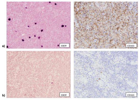 - Kamper, P.; Benedix, K.; Hamilton-Dutoit, S.; Honoré, B.; Nyengaard, J.R.; d’Amore, F. Tumor-infiltrating macrophages correlate with adverse prognosis and Epstein-Barr virus status in classical Hodgkin’s lymphoma. Haematologica 2011, 96, 269–276. [Google Scholar] [CrossRef]