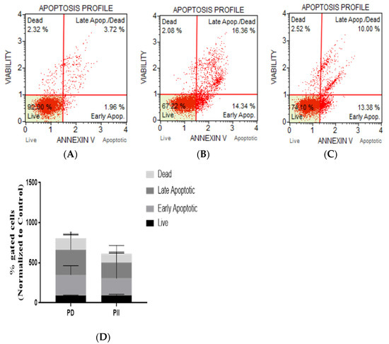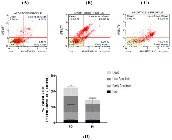 For quantitative molecular analysis, the protocol followed was as described [25]. Cells were plated at a density of 100,000 per well in 6 well plates and allowed to adhere for 24 h. The cells were treated with 0.5 µM of PD or PII individually in triplicates for 72 h. Controls with no treatments were maintained in parallel with the treatment groups. After 72 h, cells were harvested by trypsinization and prepared as per the Muse assay protocol for Annexin V and Dead cell (MCH100105). The stained cells were analyzed on Muse cell analyzer (Millipore, Burlington, MA, USA).