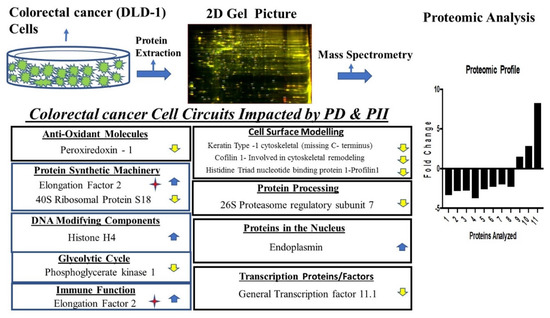 Among the upregulated entities, the levels of Endoplasmin (heterogeneous nuclear riboprotein U-like protein) increased. This is in contrast to its downregulation in renal carcinoma. Similarly, elongation factor 2 (EF2) was upregulated by PD and PII. In colon cancers, EF2 is reported to elicit a cellular and humoral response and is a tumor-associated antigen (TAA). Therefore, its upregulation could aid in immunotherapy for colorectal cancers. Furthermore, histone H4 levels increased as well. An increase in this entity could lead to changes in chromatin, thus affecting gene expression of these cancer cells. A schematic network depicting the key cancer circuits of the colorectal adenocarcinoma cells impacted by PD and PII is shown in Figure 6.
