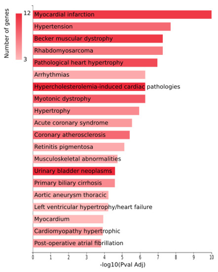 GeneCodis4 bars chart plot of the MNDR database in the direct annotation of miRNAs strategy. 15 out of 20 are heart-related disorders.